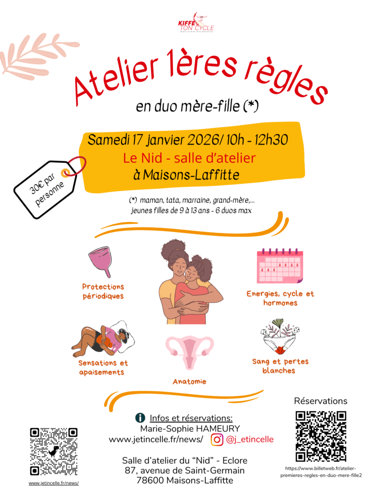 - Bientôt un nouvel atelier pour accueillir les 1ères règles en duo mère-fille : c’est le 17 janvier 2026 au « Nid » de l’association Eclore à Maisons-Laffitte. Les inscriptions sont dores et déjà ouvertes (cliquez sur « billetterie » ci dessous) – n’hésitez pas à vous manifester auprès de moi si vous avez des questions. l’atelier sera à 30 euros/personnes (60 euros le duo) et dure 2h30